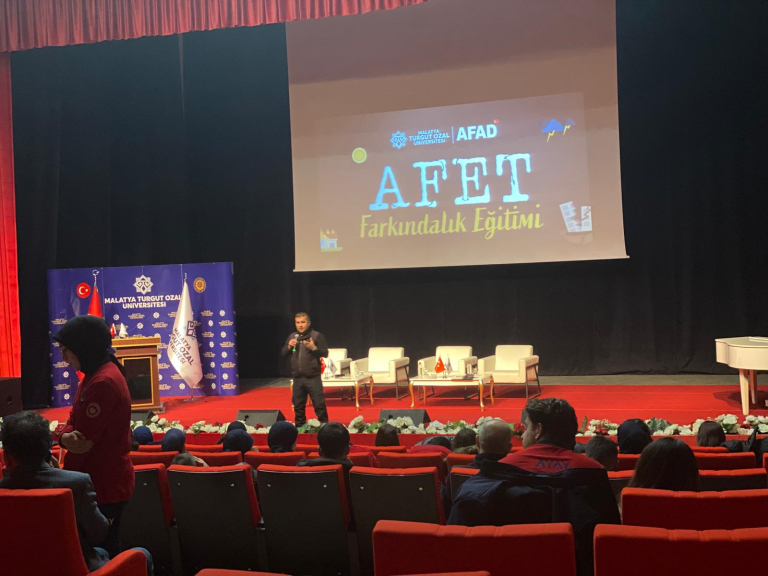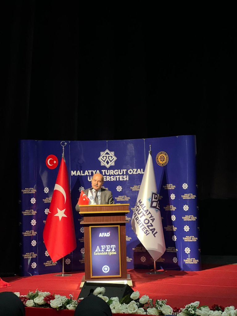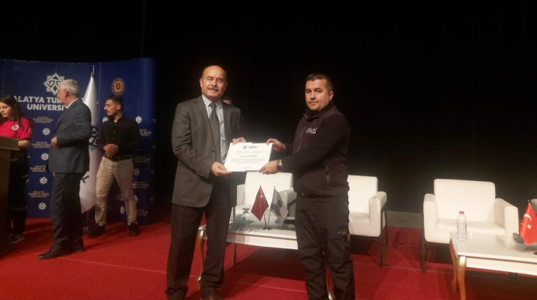 Dr. Öğr. Üyesi Ömer DEMİRBİLEK; Afad Malatya İl Müdürlüğü Eğitim Şube Müdürü Emre ALTUNTAŞ'ı sahneye davet etti. ALTUNTAŞ Afad gönüllülük sistemini, Malatya AFAD olarak verdikleri eğitimleri, personel ve ekipman kapasitelerini açıkladı.