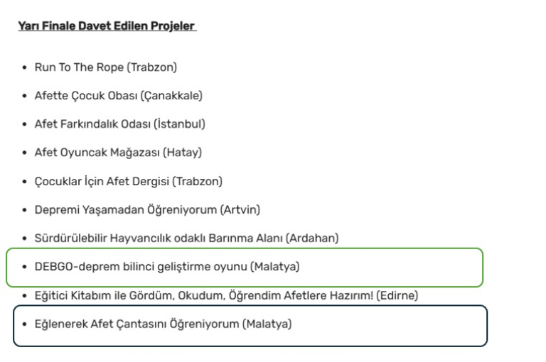 Malatya Turgut Özal Üniversitesi Acil Yardım ve Afet Yönetimi bölümü 1 ve 2. sınıf öğrencilerimizin bölümümüz Öğretim üyeleri danışmanlığında yürüttüğü Afet Risk Azaltma projelerimiz Türk-Japon Vakfı tarafından düzenlenen Afet Risk Azaltma Proje Yarışmasında yarı finale kaldılar. Yarı finale kalan projeler Dr. Öğr. Üyesi Ömer DEMİRBİLEK danışmanlığında 1. sınıf Acil Yardım ve Afet Yönetimi bölümü öğrencilerimizin yaptığı "Eğlenerek Afet Çantasını Öğreniyorum" ve Dr. Öğr. Üyesi Mert Kartal danışmanlığında 2. sınıf öğrencilerimizin yaptığı "DEBGO-deprem bilinci geliştirme oyunu (Malatya)" projeleri olmuştur. Öğrencilerimizi tebrik ediyor ve daha nice başarılar diliyoruz.